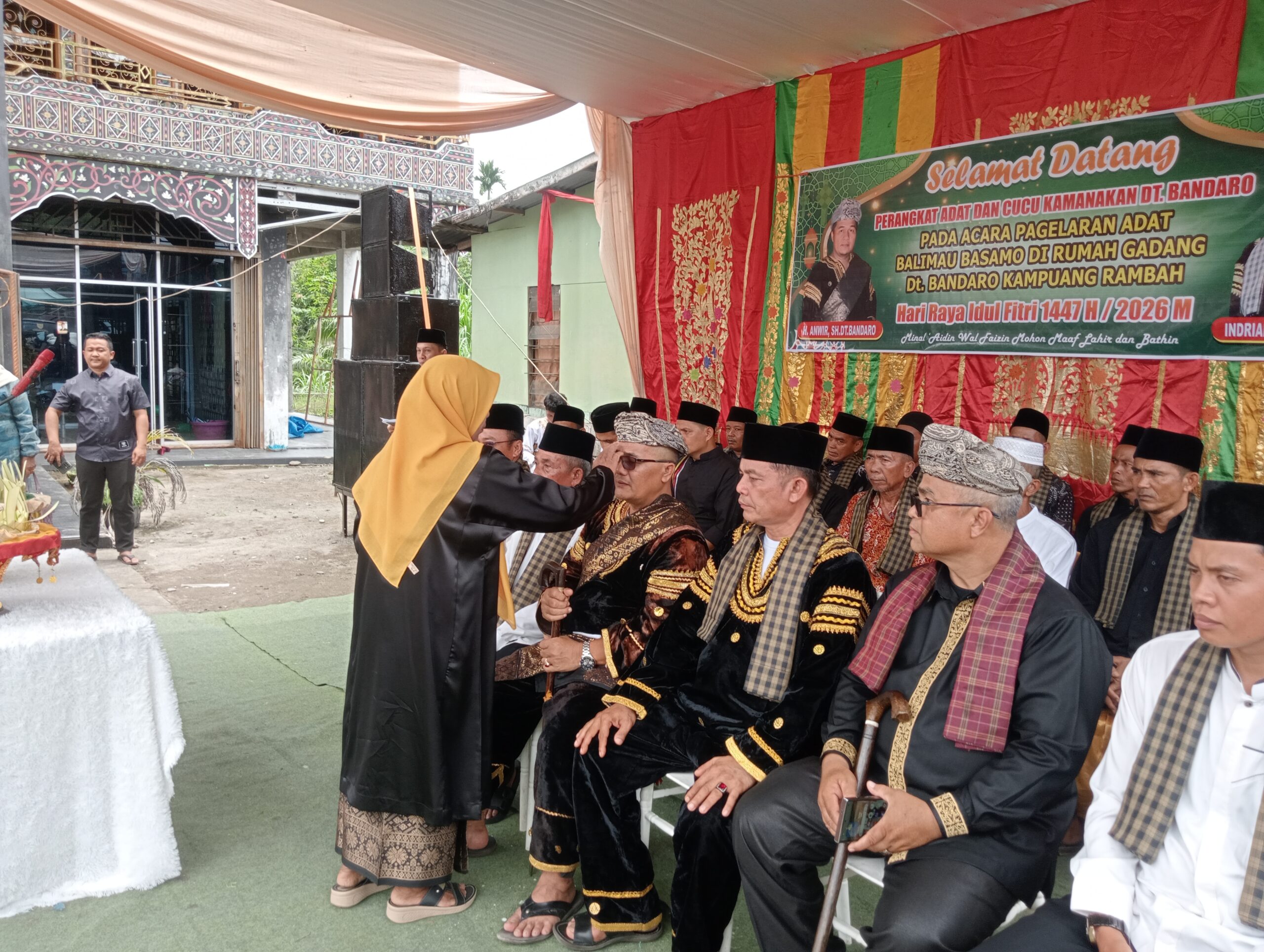 dan para masyarakat hadir menyaksikan balimau Basamo dalam momentum Hari Raya idul Fitri tahun 1447 H. yang digelar di halaman rumah gadang Dt Bandaro kampuang rambah. tersebut dan para Niniak mamak dan tokoh adat tersebut mengiringi rombongan Bupati Pasaman Barat H. Yulianto dan berjalan di arak dengan tambur Tasa dan selek Galombnag menuju Rumah Gandang dan disambut oleh cucu kemanakan serta perangkat adat Dt Bandaro.