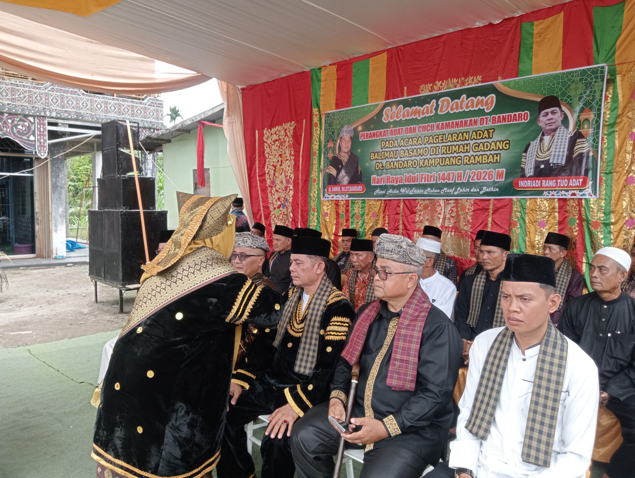 dan para masyarakat hadir menyaksikan balimau Basamo dalam momentum Hari Raya idul Fitri tahun 1447 H. yang digelar di halaman rumah gadang Dt Bandaro kampuang rambah. tersebut dan para Niniak mamak dan tokoh adat tersebut mengiringi rombongan Bupati Pasaman Barat H. Yulianto dan berjalan di arak dengan tambur Tasa dan selek Galombnag menuju Rumah Gandang dan disambut oleh cucu kemanakan serta perangkat adat Dt Bandaro.