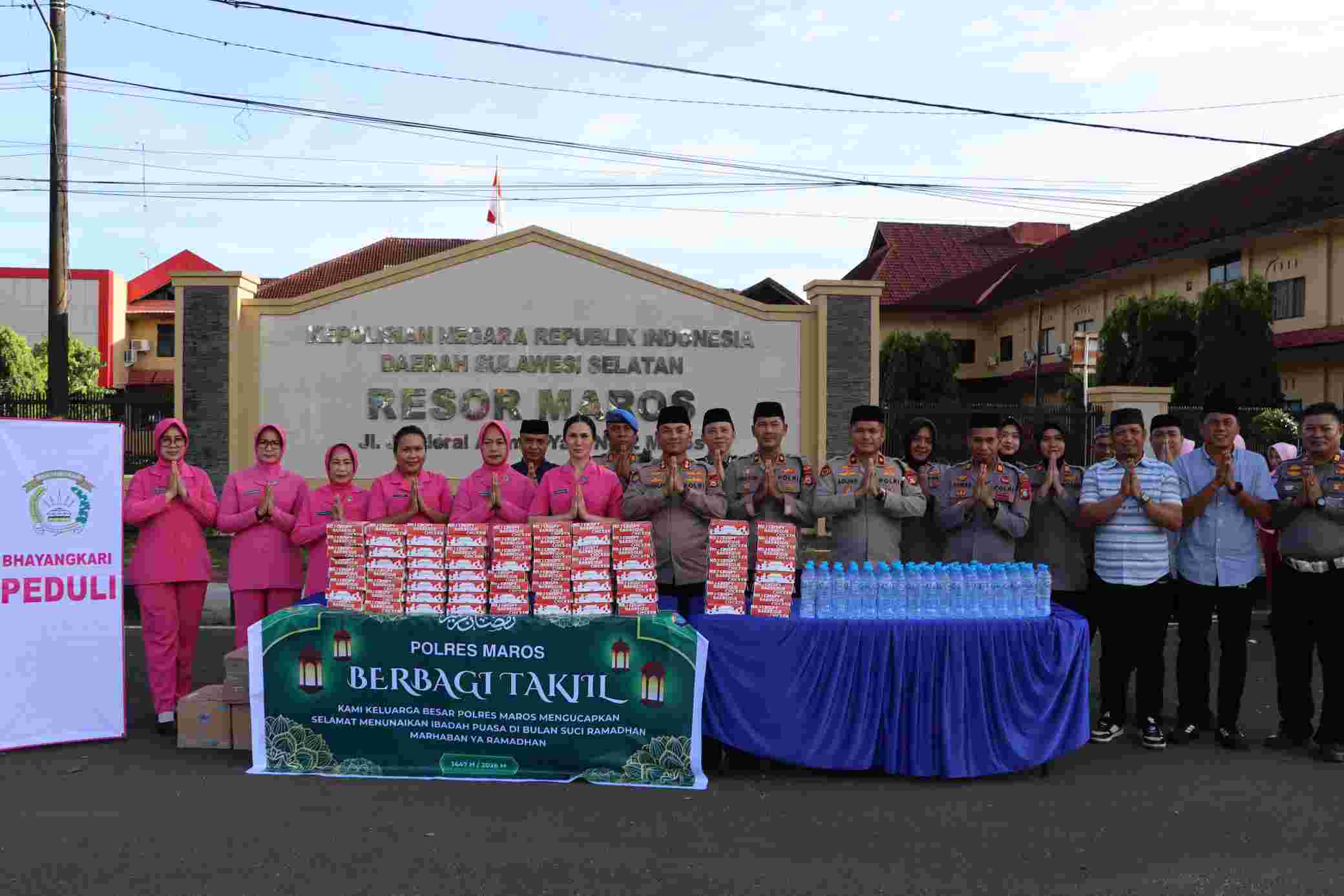 Turut hadir dalam kegiatan tersebut Wakapolres Maros Kompol Ahmad Rosma, S.H., para Pejabat Utama (PJU), serta Ketua Bhayangkari Cabang Maros Ny. Elisa Douglas bersama pengurus Bhayangkari yang ikut ambil bagian dalam pembagian takjil kepada masyarakat.