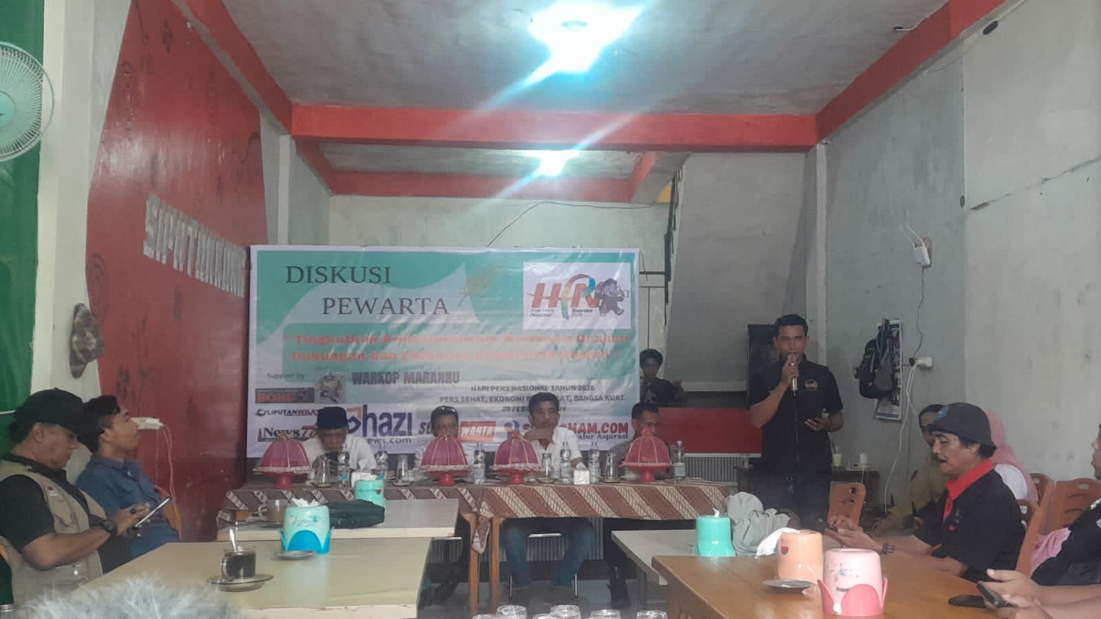 Diskusi tersebut dipandu oleh Enhal iNews77 dan dihadiri sejumlah jurnalis, pegiat media, serta tokoh pers. Kegiatan ini menjadi ruang dialog terbuka untuk membahas tantangan, peluang, dan tanggung jawab wartawan di tengah perkembangan dunia jurnalistik yang semakin dinamis.