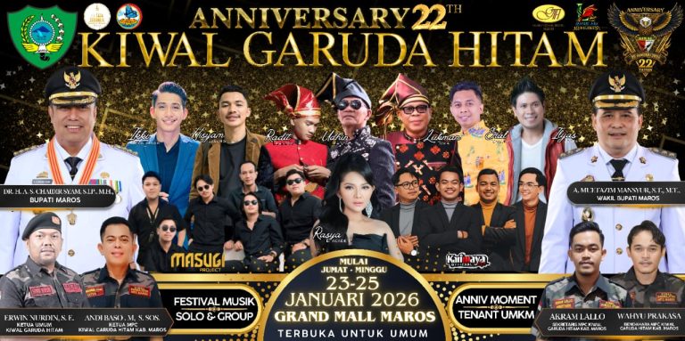 MAROS, iNews77.id – Organisasi Kemasyarakatan KIWAL Garuda Hitam akan memperingati Hari Ulang Tahun (HUT) ke-22 dengan menggelar Festival Musik dan Seni selama tiga hari, mulai Hari ini, Jumat hingga Minggu, 23–25 Januari 2026. Kegiatan tersebut akan dipusatkan di Grand Mall Maros dan terbuka untuk umum.